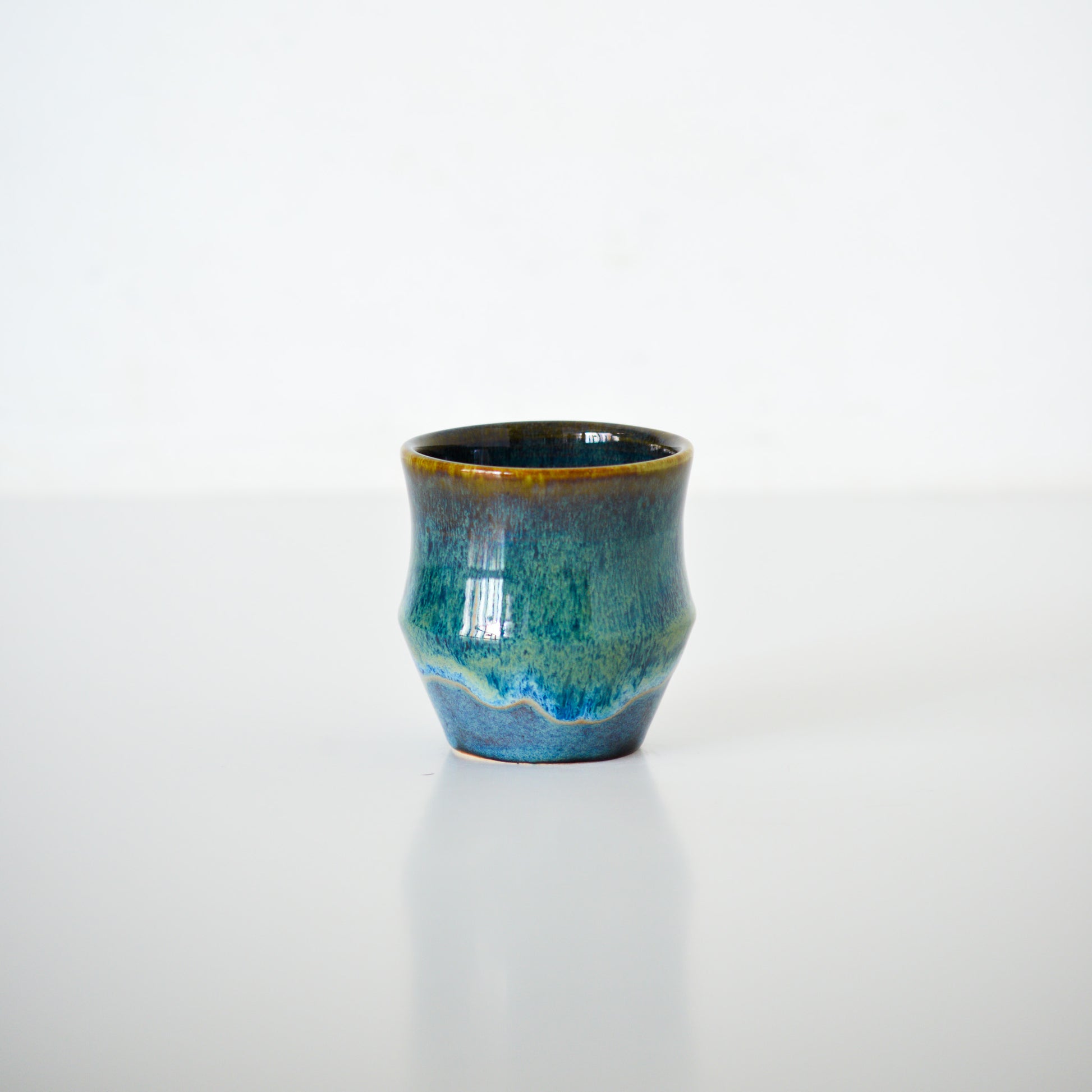Inspired by the unsettling waves of the blue and emerald ocean, this collection is handmade and hand-painted with various flowing green and blue glazes, creating the wave at the bottom part of the piece.